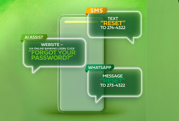 Registering or resetting your password is now more convenient with our new WhatsApp service for our Online, Mobile and Telebanking. Just send a WhatsApp message to 273-4322 to begin.
