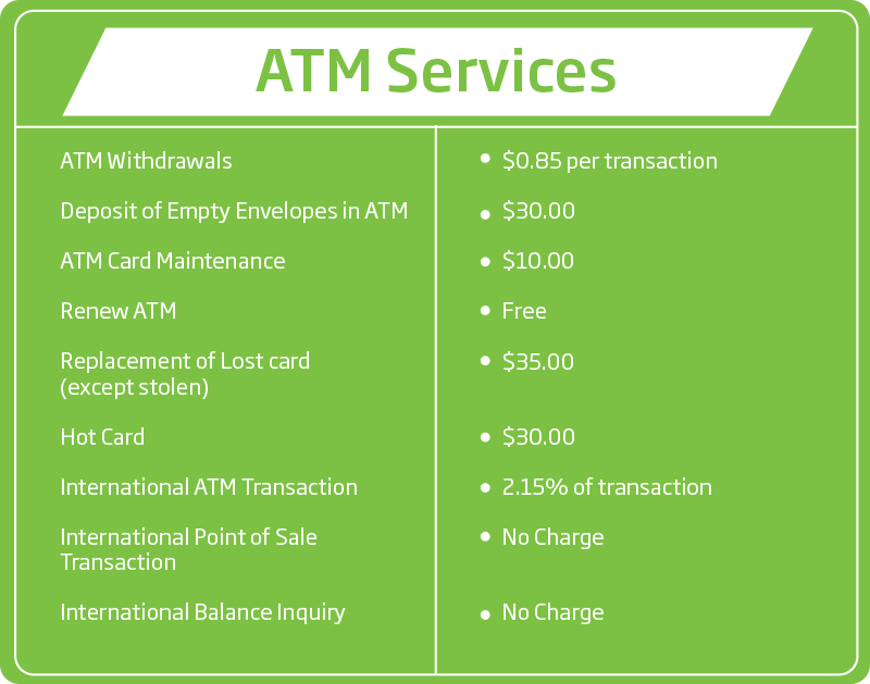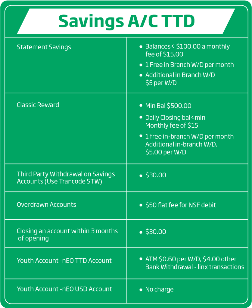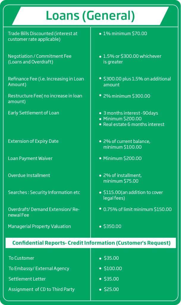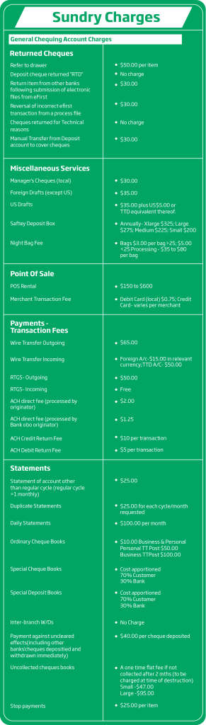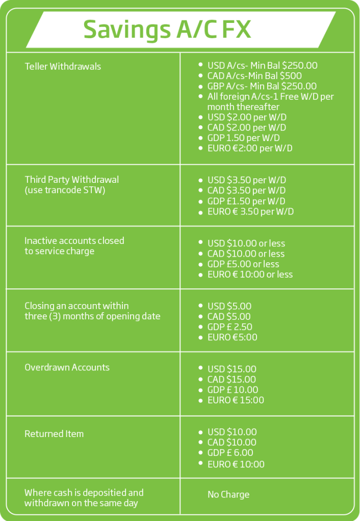 Please note that the information shown does not include all of our fees and service charges. Requests for additional information on charges can be made at any branch of First Citizens Bank Ltd.