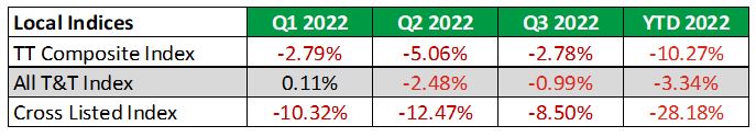 Similar to the international stock market, the local stock indices are also down, with the All T&T Composite Index declining by 10.27%, led by the Cross-Listed Index that posted a loss of 28.18%. The stocks with the largest share price gains over the nine month period ending September 2022 were Angostura Holdings (AHL), Agostini’s %, Limited (AGL) and Scotiabank Trinidad & Tobago (SBTT) with returns of 38.50%, 38.46% and 14.45% respectively. Leading the declines were NCB Financial Group Limited (NCBFG), West Indies Tobacco Company (WCO) and Unilever Company Ltd (UCL) with losses of 43.82%, 21.09% and 19.75% respectively.