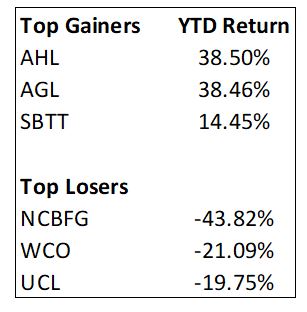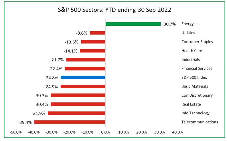 From a sector perspective, Energy was the only sector that posted positive returns on a Year to Date (YTD) basis, with a gain of 30.7%. The worst performing sectors year to date are Telecommunications (39.4%), Information Technology (31.9%) and Real Estate (30.4%).