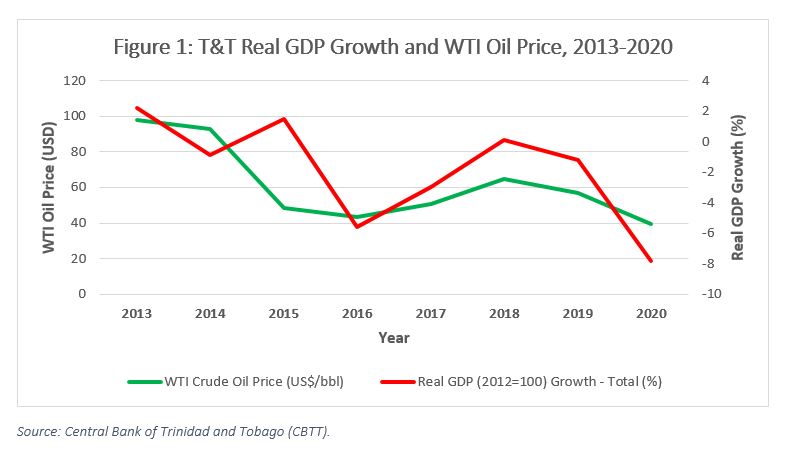 In everyday conversation as well as in official statements such as the National Budget speech, the oil price is an indicator at the forefront when forecasting the fortunes of the T&T economy. As Figures 1 and 2 below show, this is with good reason since both the country’s GDP growth and government revenue track very closely the fluctuations in the West Texas Intermediate (WTI) oil price. Moreover, this relationship has remained tight in recent years.