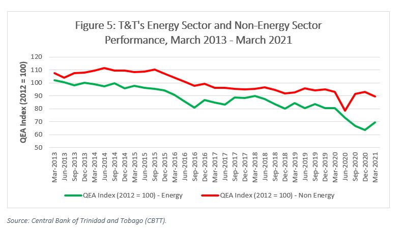 Noting that the domestic economy remains sensitive to the prices of hydrocarbon commodities, we turn our attention to the sectoral composition of economic activity itself. The Quarterly Index of Real Economic Activity (QEA), an economic performance indicator compiled by the Central Bank of Trinidad and Tobago, shows that energy sector output at March 2021 stood at only 69.5% of its 2012 level, while non-energy sector output was 89.4% of its 2012 level (see Figure 5). By this measure, the non-energy contribution to output has risen, and so in a literal sense the economy has become more diversified away from oil and gas. However, this change in relative terms cannot hide the reality that overall output in both the energy and non-energy sectors has declined significantly within that same time.
