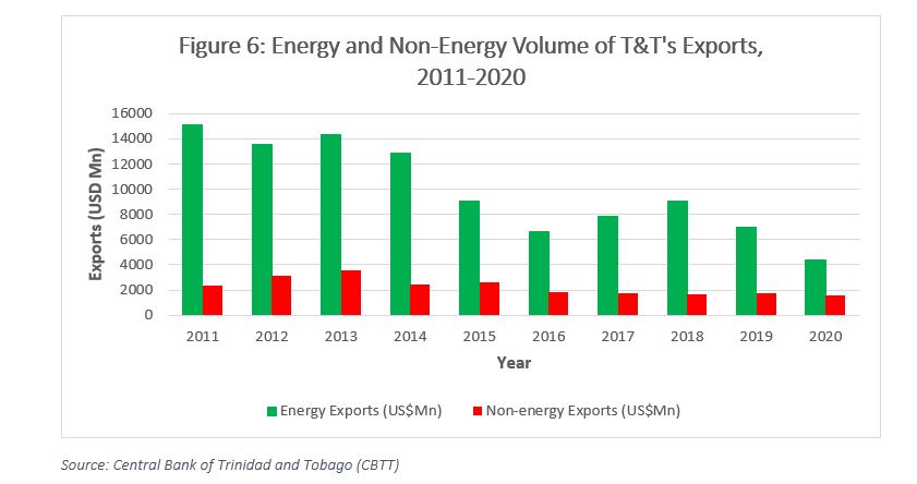 International trade performance, especially for small open economies such as Trinidad and Tobago, is a useful marker of a country’s economic development, since exports are subject to international competition and are less susceptible to the distortive impacts of subsidies. Looking at the trade data from a diversification perspective, a familiar pattern is apparent when we observe the relative proportion of Trinidad and Tobago’s exports split between energy and non-energy (see Table 2 below). Non-energy tradeable products have doubled their percentage contribution of exports from 13.4% in 2011 to 27% in 2020 with a generally upward trend observed throughout the decade. On a relative basis, one could say that the export base of the country has become more diverse. However, the absolute value of those exports (seen in Figure 6) show that this phenomenon is primarily driven by the decline in energy exports since the collapse of the commodity supercycle in 2014, while the value of non-energy exports has remained relatively flat throughout the decade.
