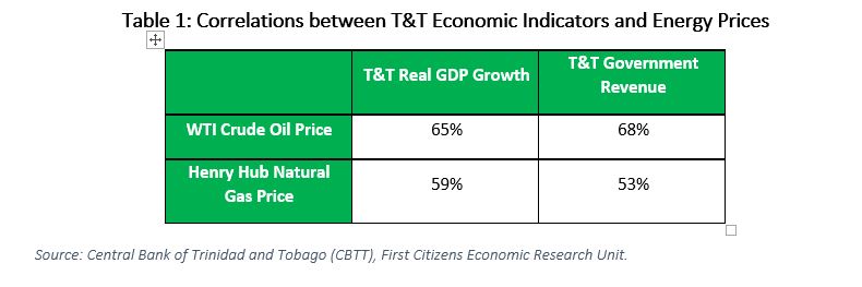Interestingly, despite the pre-eminence of natural gas in T&T, the oil price is still more strongly correlated with GDP growth and government revenue (65% and 68%) than the gas price (59% and 53%), illustrated in Table 1 below.