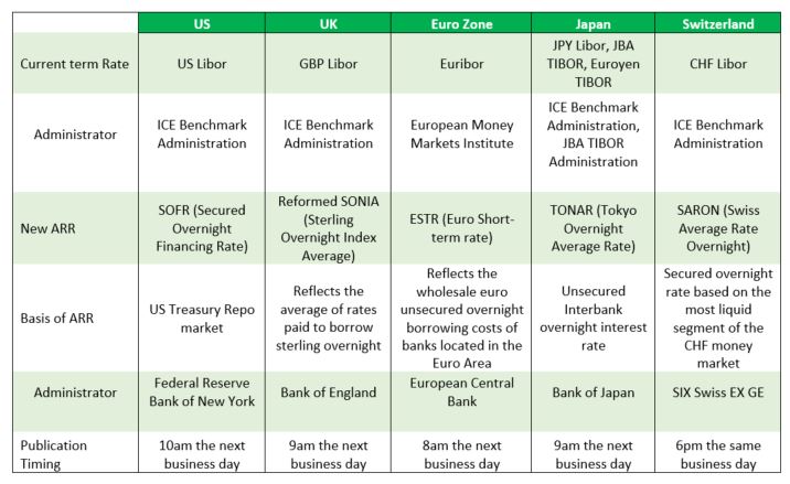 There are also notable differences between the ARRs and the LIBOR. Two key distinctions are that LIBOR has a term (for example one month, three month) and is broadly representative of bank funding costs at differing terms. The ARRs are only overnight rates. Thus they work differently and may require new products that are built using ARRs, requiring different pricing and valuations.