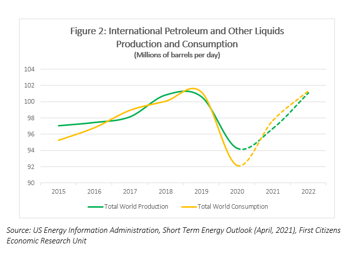 The world’s two largest economies, the US and China are both projected to register strong growth in 2021 of 6.4% and 8.4% respectively. These two countries are also the top two consumers of oil in the world, accounting for 20% and 14% of global consumption. At the time of the release of the WEO in April, the IMF projected economic growth of a robust 12.5% for India in 2021 – one of the very few countries expected to post a double-digit expansion. However, since April, India has become one of the worst hit countries struggling to contain a deadly wave of the COVID-19 virus. The total number of positive cases in India surpassed 20 million during the first week of May, with nearly seven million recorded in the month of April alone and over 400,000 cases per day being reported. Over 200,000 persons have died as a result of the virus and the health care system has become inundated as it is believed that the official numbers reported are grossly underestimated. The current health crisis in India is certainly worrying and will dampen energy demand into 2021, as India is the world’s third largest consumer of crude.