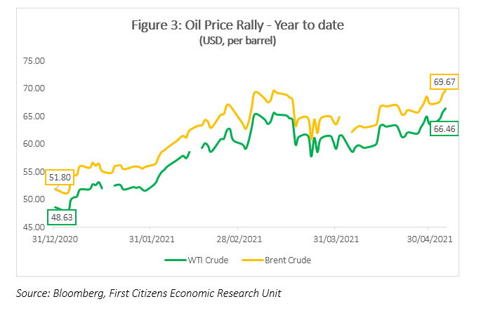 As the administration of the vaccines continues in many of the advanced economies globally, oil prices have been trending upward. Adding to the optimism in these economies is the sizeable fiscal support provided by those governments, specifically in the US. Both factors have boosted prospects for the global economy and a revival in energy demand. Notwithstanding these dynamics, many large emerging and developing economies are battling a deadly surge in COVID-19 cases and various strains and this devastative development will likely weigh on global demand. Further, the possibility of increased supply from the Organization of Petroleum Exporting Countries and alliances (OPEC+) also softens the outlook for crude oil prices.