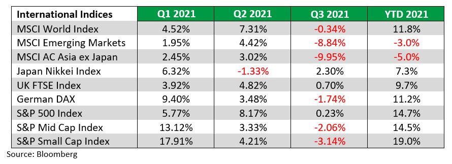 By market capitalization, Small and Medium cap stocks underperformed their large cap counterparts in Q3 2021, with losses of 3.14 percent and 2.06 percent respectively, down from positive returns in Q2 2021.