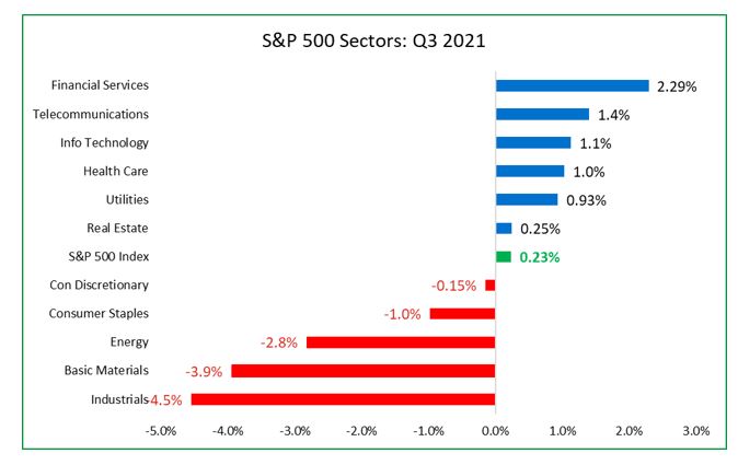 From a sector perspective, six out of eleven S&P sectors posted positive returns in Q3 2021, compared to nine out of the eleven sectors in Q2 2021. Financial Services (2.29 percent), Telecommunications (1.4 percent) and Information Technology (1.10 percent) were the top performing sectors in Q3 2021 and outperformed the S&P 500 index. The worst performing sectors that posted losses over the quarter were Industrials (4.5 percent), Basic Materials (3.9 percent) and Energy (2.8 percent).