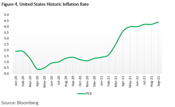 In Q321, real GDP growth of 2.0% was driven by increased private inventory investment, personal consumption expenditure (PCE) along with state and local government spending. However, this marks a deceleration from 6.7% in the previous quarter as residential fixed investment, federal government spending and exports showed significant declines. Despite the deceleration in growth, inflation as measured by PCE rose to 4.4% in September from 4.2% in August as food prices and energy commodities prices rose substantially. Although personal income decreased by 1.0% in September according to the Bureau of Economic Analysis, PCE continues to rise on a monthly basis. The decline in personal income reflected the expiration of government social benefits as various job and wage retention schemes launched to combat the economic fallout from the pandemic were unwound. Employment conditions continue to improve as various sectors reopened, including leisure and hospitality, which showed notable job gains in October. The unemployment rate declined to 4.6% in October from 4.8% in September as employment rose markedly in sectors such as manufacturing, transport, construction as well as leisure and hospitality. Notwithstanding the month on month improvement, there is some degree of slack in the labour market as the pre-pandemic unemployment rate was much lower at 3.5% measured in February 2020.