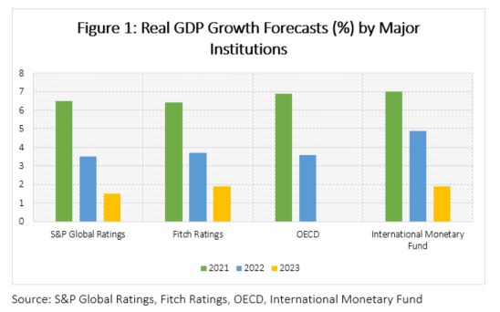 The outlook for the US economy is favourable. Economic growth throughout the year will be supported by strong household consumption as the government’s effective vaccination drives allow for the lifting of pandemic-related restrictions. Growth will taper off to 4.9% and 1.9% in the 2022 and 2023 respectively but will be supported through large infrastructural projects such as the AJP and AFP. These plans will contribute significantly to the reduction in unemployment in the medium-term to 3.0% by 2023. The resumption of international trade will result in a gradual reduction in the current account deficit from 3.8% of GDP in 2021 to 1.9% by 2026 as the pace of export growth picks up over the horizon due to strong global demand for US goods and services.