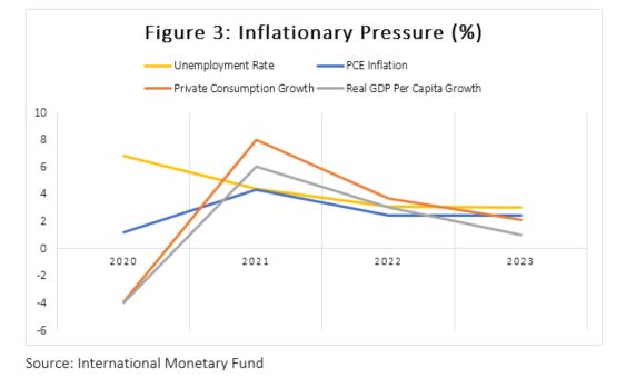 Private consumption declined by 3.9% in 2020 due to government restrictions. Reopening of the economy will lead to a reversal in this contraction with private final consumption expected to grow by 8.0% in 2021 as household spending recovers. In the first half of the year 2021, household spending was boosted by robust demand in the automotive and retail sectors. Spending on bars and restaurants as well as clothing helped lift the inflation rate to 3.8% in May 2021. Supply-side shortages of semiconductors for automobiles along with higher commodity prices provided upward pressure on the inflation rate. Inflation is projected to remain elevated in 2021 and 2022 as the economic recovery takes root. The recovery in commodity prices will also provide upward pressure on inflation averaging 4.3% and 2.4% annually in 2021 and 2022, respectively. Through the medium-term, strong wage growth will increase household incomes and contribute positively to household consumption, thus supporting inflationary expectations.