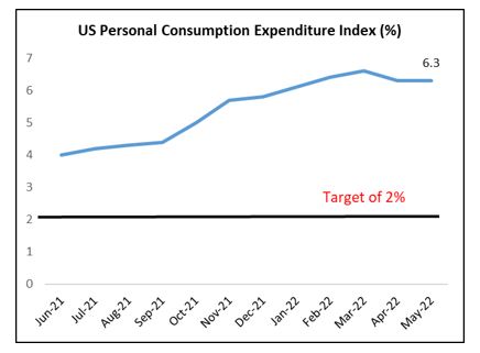 The US Personal Consumption Expenditure Price Index (PCE) which is the Federal Reserve’s preferred inflation measure, remains elevated and stood at 6.3% in May 2022, above the long-run target of 2%. Inflationary pressures have been mainly driven by higher energy prices which have increased significantly during the year owing to the Russia and Ukraine conflict.