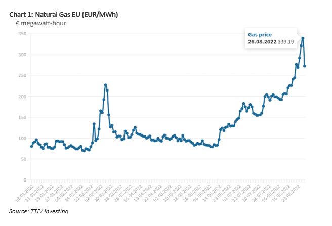 Europe continues to face several other challenges contributing to its downturn. Firstly, the temporary suspension of its gas supply from Russia to Germany, has resulted in gas prices surging to an all-time high of €339 per Megawatt-Hour in August. According to Capital Economics, most European nations will be more adversely affected by the rising gas prices today than by the oil crises of 1974 and 1979, both of which were “followed by recessions.” Russia’s decision to suspend natural gas supplies via the Nord Stream 1 pipeline, which connects Russia to Germany via the Baltic Sea has caused a jump in gas prices, raising fears of energy rationing of throughout the coming winter season in Europe. Russia has claimed this decision was driven by the economic sanctions imposed on the country by the West and resumption of gas supplies are completely dependent on these sanctions being lifted.