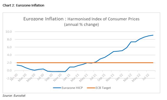 With inflation continues to erode purchasing power, there is increased pressure on the ECB to raise interest rates. On 8 September, the ECB raised interest rates 75 basis points, taking its benchmark rate to 1.25% to tackle record inflation and has warned that interest rates can raise further since inflation remains far too high and is likely to stay above target for an extended period. According to latest data from Eurostat, inflation in the Eurozone rose 9.1% in August. Runaway energy prices, which have increased dramatically since Russia’s invasion of Ukraine in February, are fuelling inflation. The ECB has revised up its inflation expectations, forecasting an average 8.1% in 2022, 5.5% in 2023 and 2.3% in 2024.